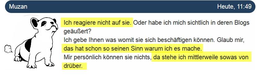 und während du dich nur damit beschäftigst, blogs über mich zu erstellen, weil ich dir so ungeheuer wichtig bin, und dann deinen geistigen dünnschiss abzulassen, um mal deine worte zu gebrauchen, mach ich nun mal anderes anderes. sogar das scheint dich zu stören, wenn dich das so triggert.